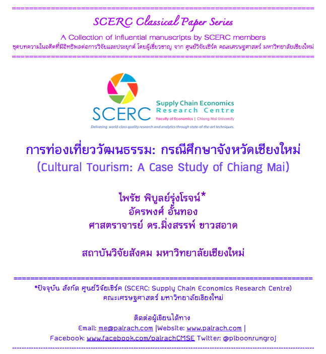 บทความนี้เขียนโดย อ.ดร.ไพรัช พิบูลย์รุ่งโรจน์ ผู้อำนวยการศูนย์วิจัย SCERC ได้ร่วมกับ ดร.อัครพงศ์ อั้นทอง และ ศาสตราจาารย์มิ่งสรรพ์ ขาวสอาด ครั้นทั้ง 3 ท่าน ร่วมงานกันที่ สถาบันวิจัยสังคม มหาวิทยาลัยเชียงใหม่ ในปี ค.ศ.2005 ศึกษาเรื่อง “การท่องเที่ยววัฒนธรรมในจังหวัดเชียงใหม่”